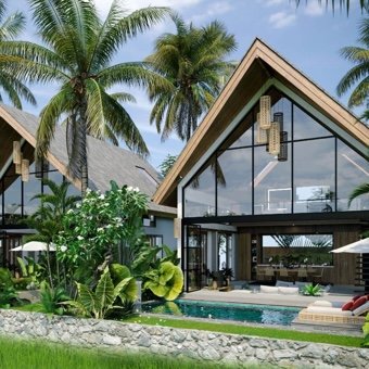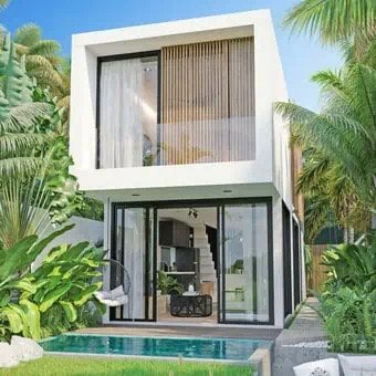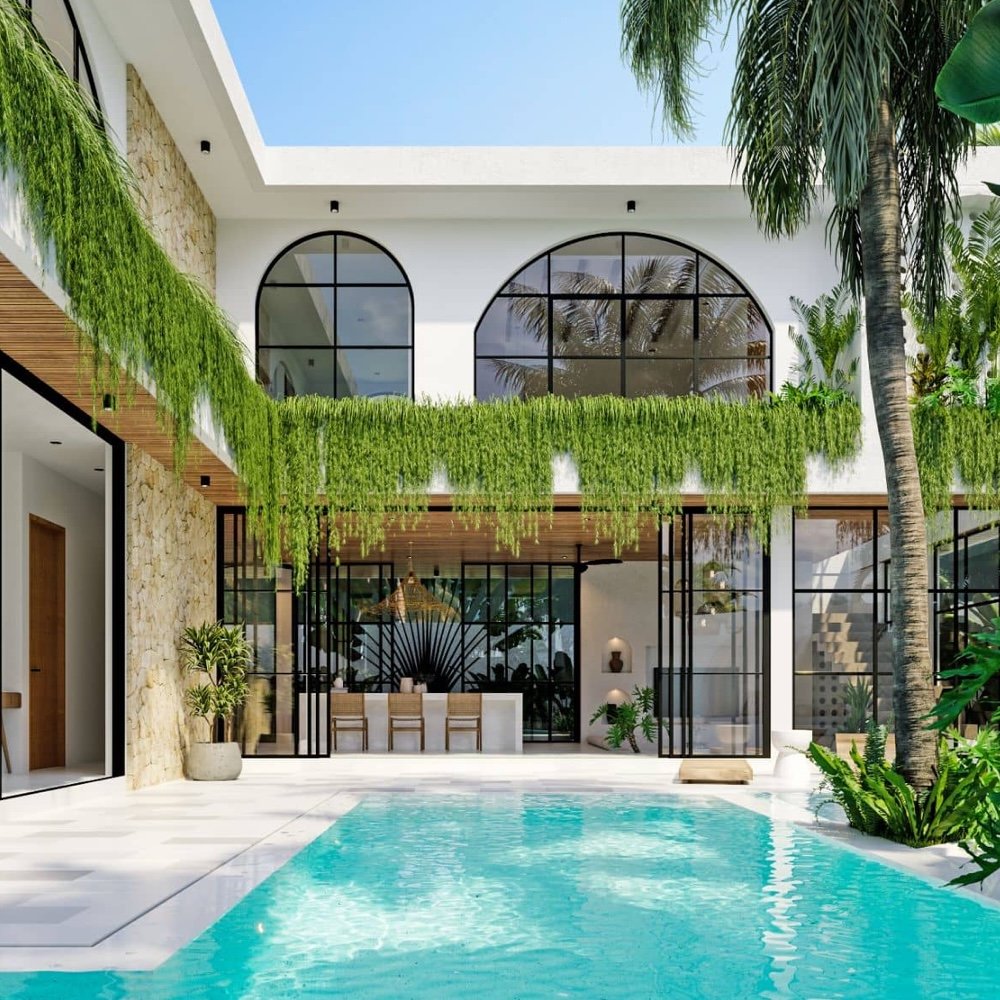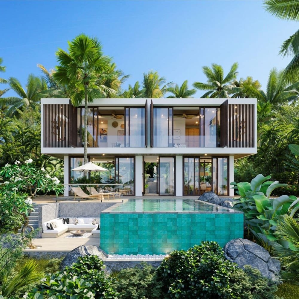 The spacious modern Kolkata smart home design is complete with 3 bedrooms, a tropical pool, and an outdoor sunken sofa. uses natural stone and rich wood tones to create a luxurious feel.