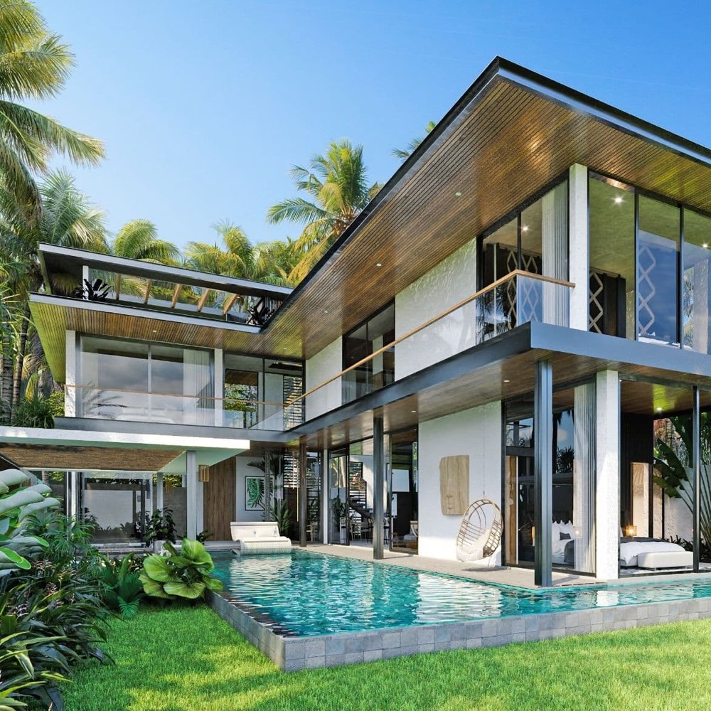 The spacious modern Kolkata smart home design is complete with 5 bedrooms, a tropical pool, and an outdoor sunken sofa. uses natural stone and rich wood tones to create a luxurious feel.